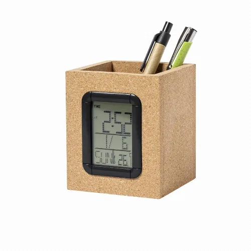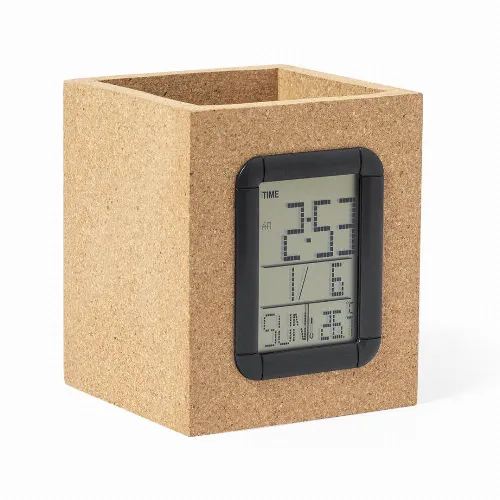 Made of natural cork, with thermometer, calendar and alarm functions. Battery operated (button batteries included) and presented in an attractive eco-design box.