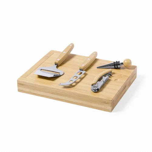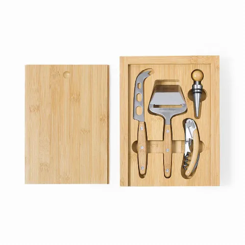 Made of bamboo, with cutting board cover and metal accessories with bamboo handle. Including corkscrew, lid, knife and cheese grater. Presented in an individual eco-design box.