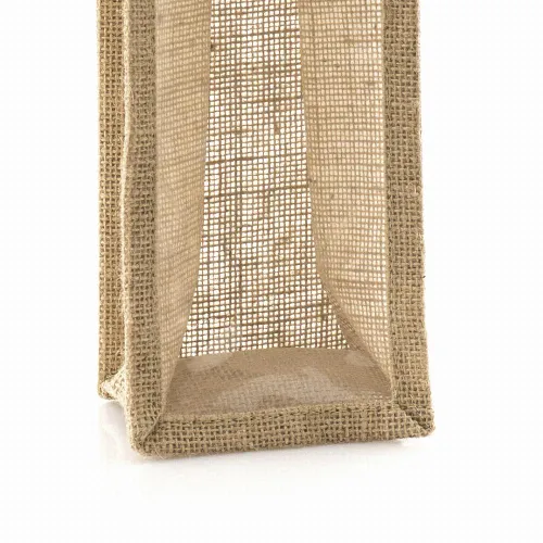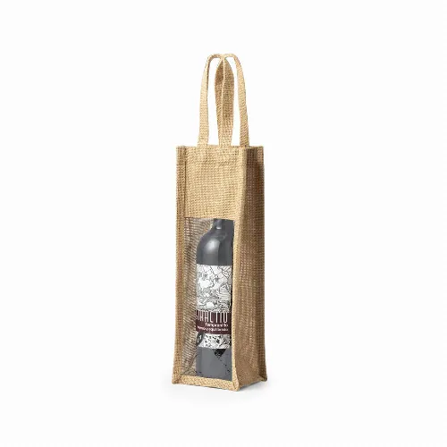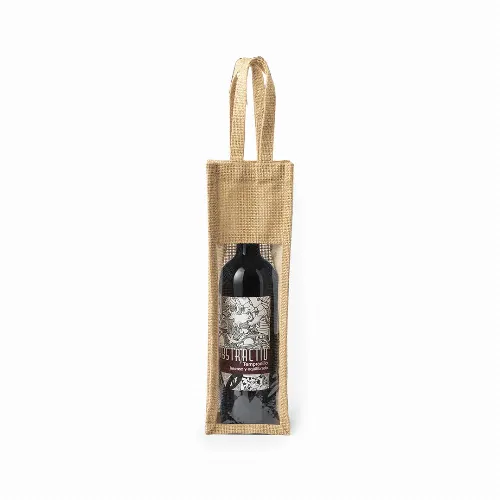 wine bottle jute bag with transparent window, reinforced piping and handles.