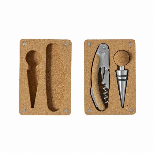 Stainless steel accessories. Includes two-stage corkscrew and stopper. Presented in an individual cork case, with a die cut inside and magnetic closure.Made with plant-based elements to promote the use of natural raw materials and reduce polluting emissions.
