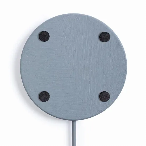 Wireless charger of round design in combination of natural cut bamboo pieces and limestone cement, a conglomerate formed by the mixture of natural materials, mainly ground limestone and water, obtaining a material of great consistency and durability.