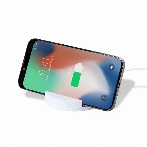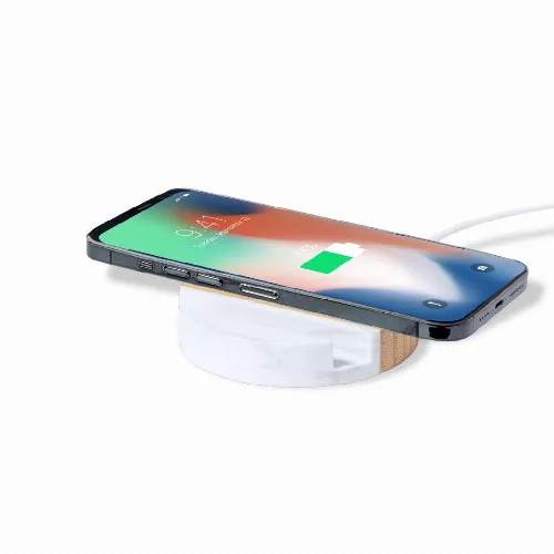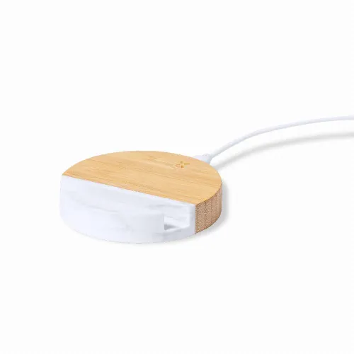 Round design and made in natural materials: bamboo stand and marble extract holder. Compatible with devices equipped with Qi wireless charging technology. Including Type C charger cable and instruction manual in English and Spanish. Presented in an individual kraft design box. Manufactured according to RoHS standards and in compliance with the following safety requirements: Overheating protection system. Over-charge protection system. Blocking system to prevent short circuits.