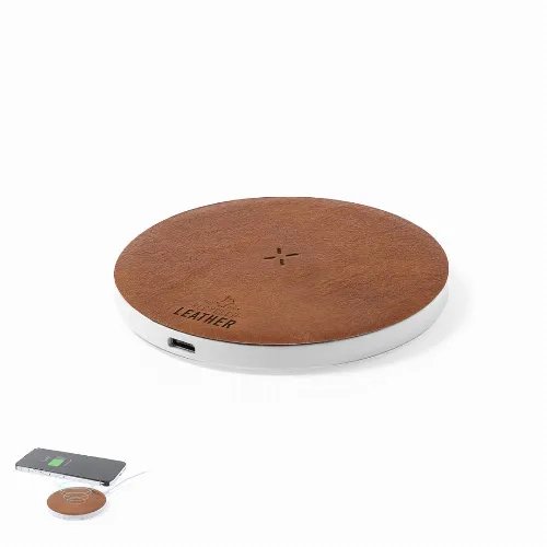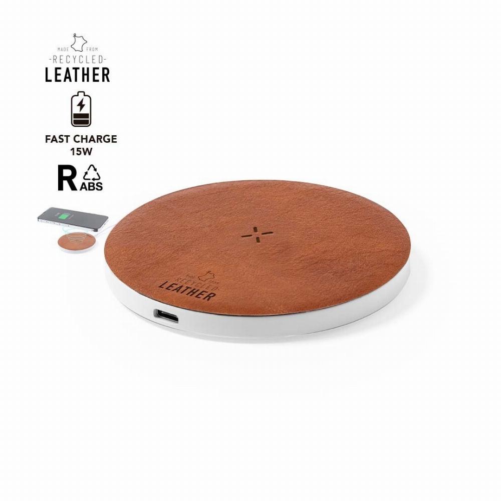 15W wireless charger, made in a combination of RABS and recycled leather.