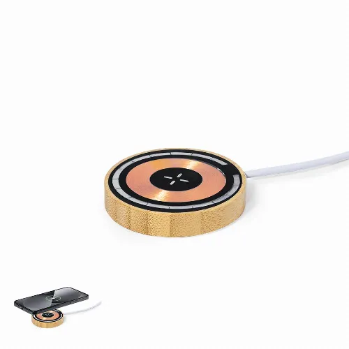 With bamboo base and Magsafe magnetic attachment, compatible with devices equipped with Qi wireless charging technology. Type C connection, with instruction manual in English and Spanish. Presented in an individual kraft design box.Materials such as bamboo encourage the use of natural raw materials, reducing pollutant emissions. It comes from a highly resistant and versatile plant with rapid growth and regeneration, making of it an excellent alternative to traditional wood.Manufactured according to RoHS standards and in compliance with the following safety requirements: Overheating protection system. Over-charge protection system. Blocking system to prevent short circuits.