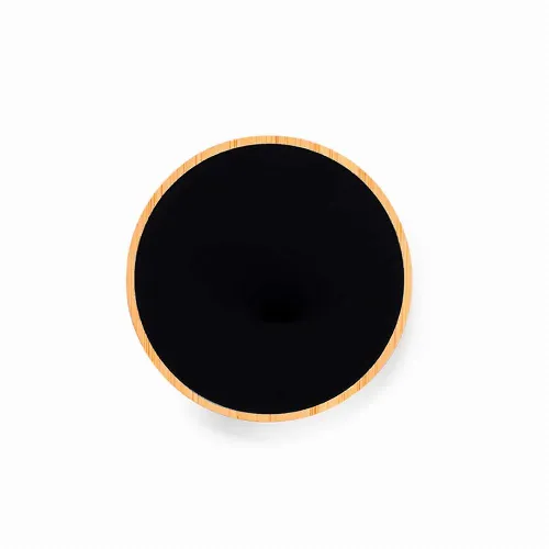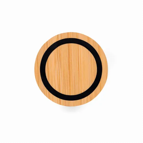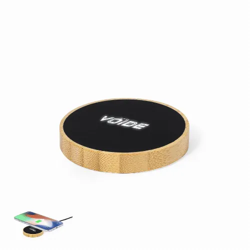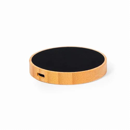 Made of bamboo, with elegant black surface. Inner LED light and outer coating specially designed for laser engraving, lighting up the logo. With 15W charging function, compatible with devices equipped with Qi wireless charging technology. With non-slip base, including Type C charger cable and instruction manual in English and Spanish. Presented in an individual kraft design box.