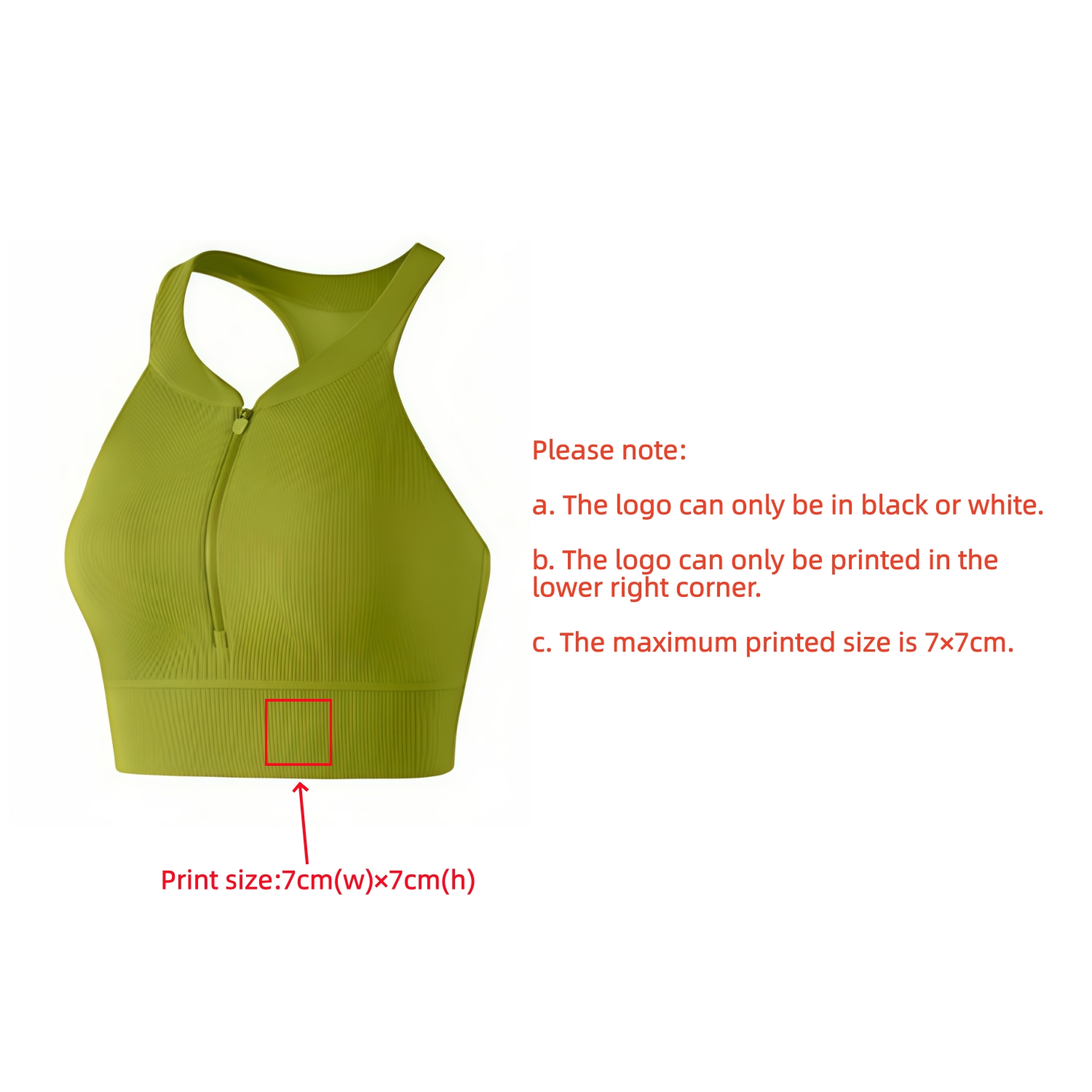 Experience ultimate comfort and support during workouts with this high-quality zip-front racerback Sports Bra. Its spandex-nylon fabric blend delivers a soft, flexible feel that adapts to your movements—ideal for yoga, boxing, fitness, and more. Heat transfer printing is available for adding your company logo, brand name, and slogan or any design you like, ensuring a seamless integration with the overall design. Whether you’re hitting the gym or engaging in your favorite physical activities, this sports bra provides a perfect combination of comfort, support, and aesthetics.
