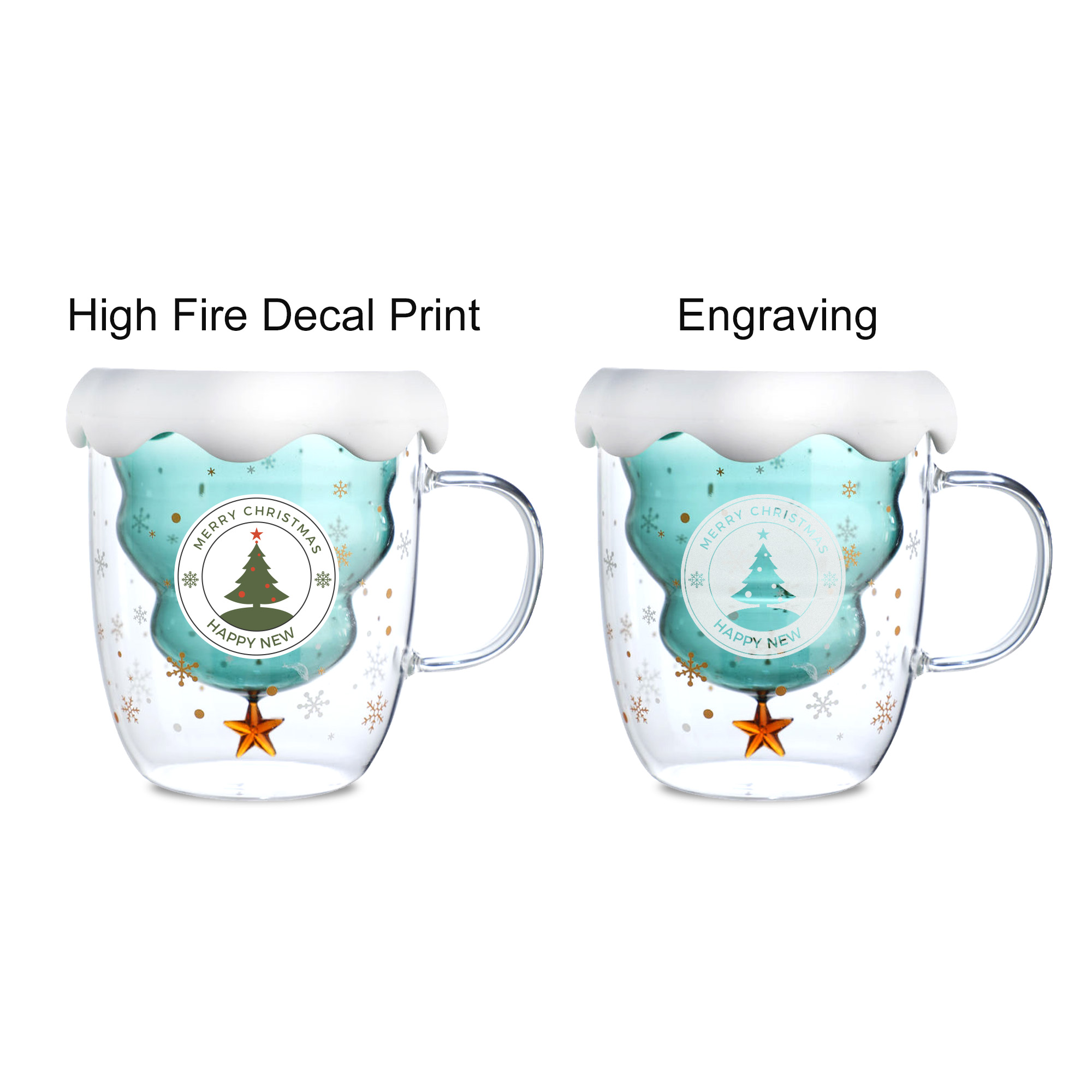 Get your branding seen with our new Xmas Tree Double Wall Mug! Crafted from borosilicate glass. With a capacity of 300ml. The distinctive Xmas tree shape not only stands out but also enhances the drinking experience. The double-wall design keeps your drinks at the perfect temperature, reducing heat or cold transfer by over 30°C. With engraving or high fire decal print to highlight your branding. Suitable for use as coffee, tea or beer and other beverages. Perfect as a gift for cafes, bars, hotels or home use.