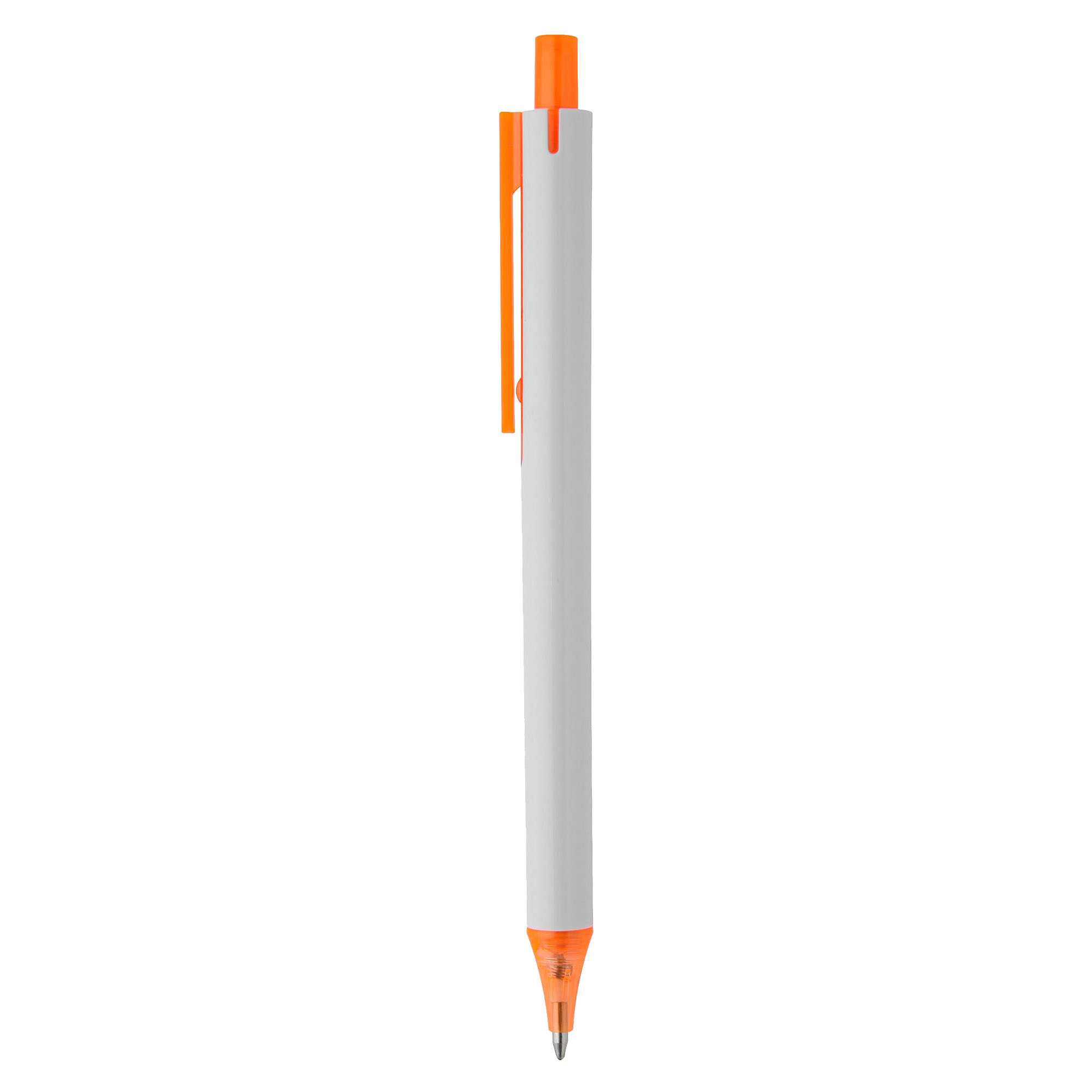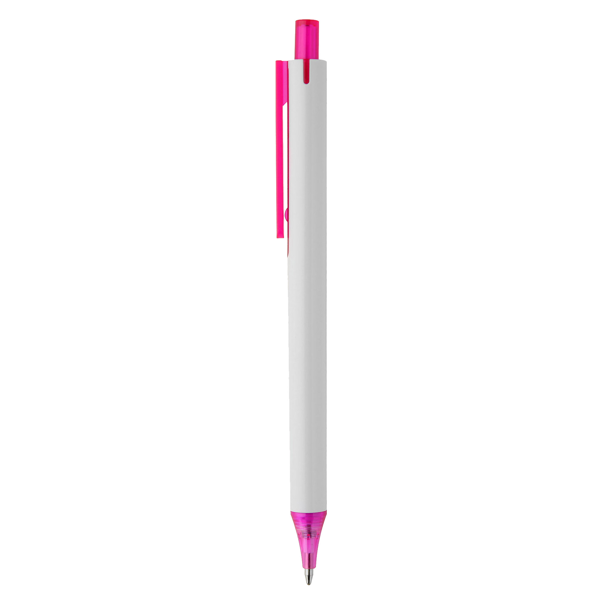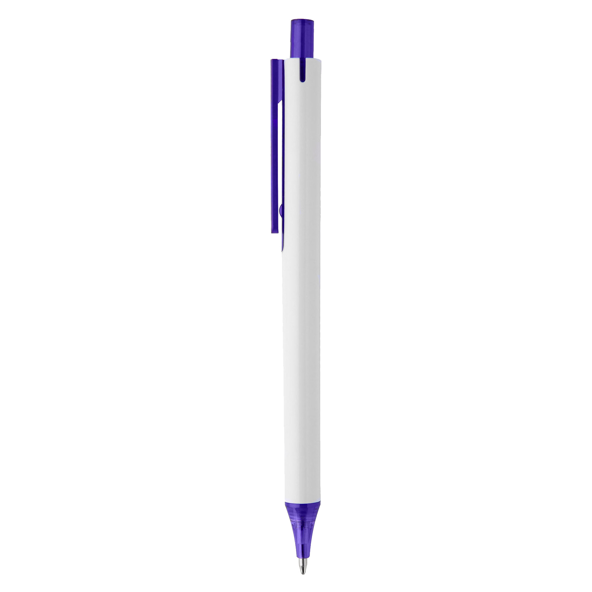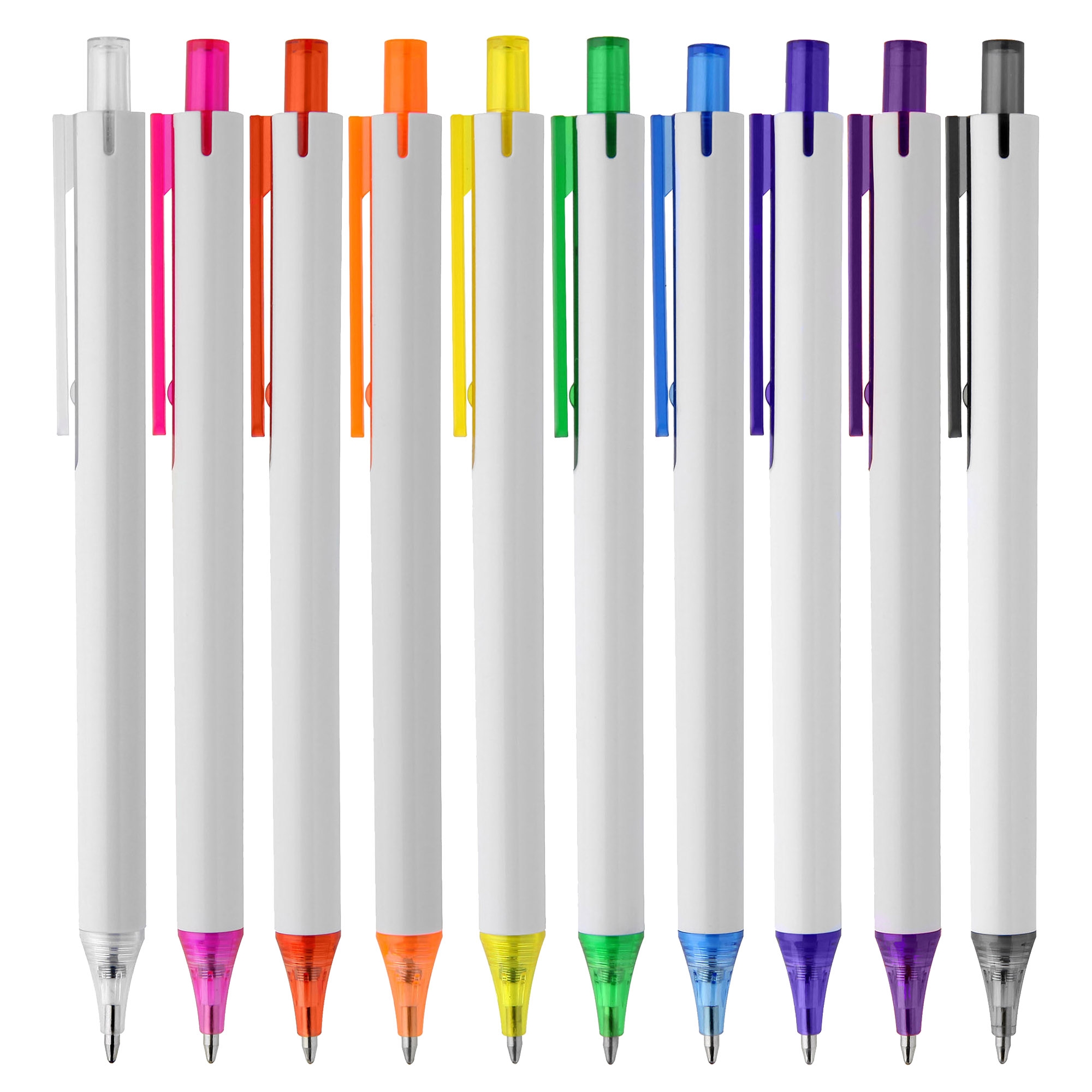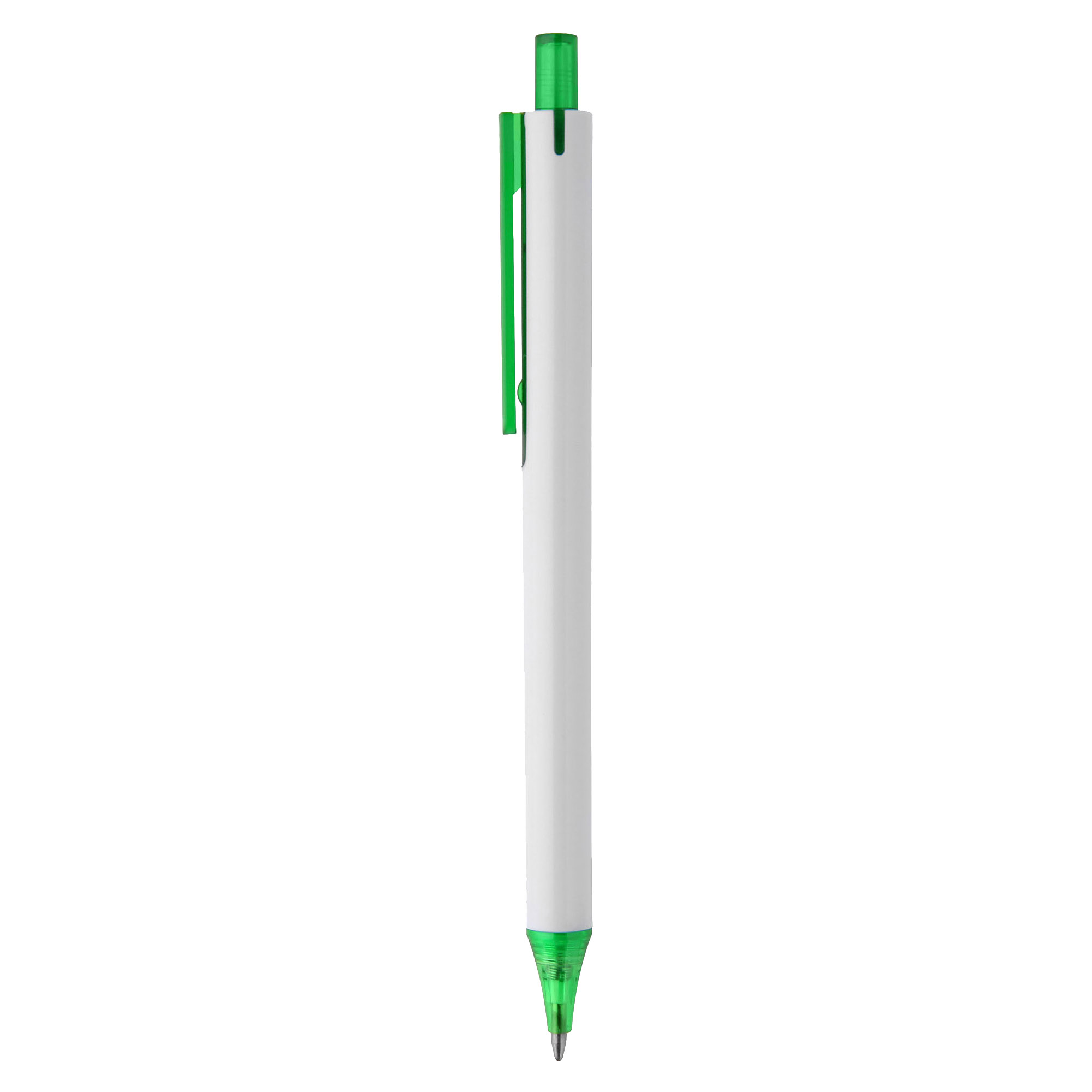 Simple slim design with click action plastic pen solid white barrel with coloured transparent trim it has high quality German manufactured black ink refill 1800 meters writing distance tungsten carbide ball provides you with quality writing a budget pen with simple modern design and comfortable writing ready for your next large event.
