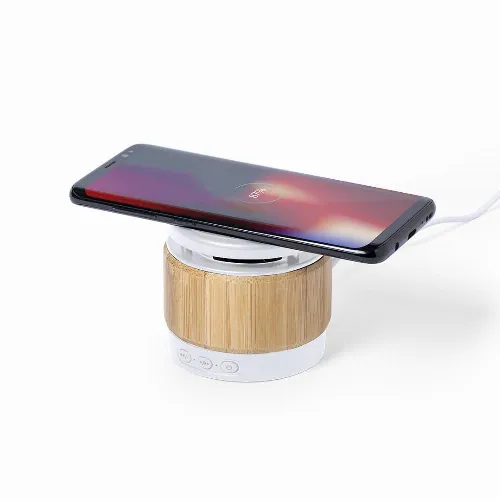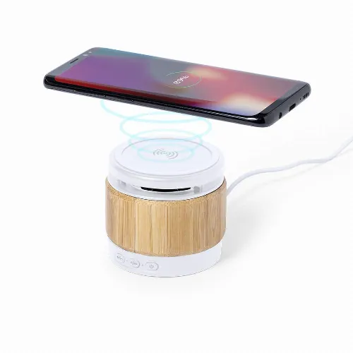 Bluetooth® nature line speaker with integrated 5W wireless charger and compact design.