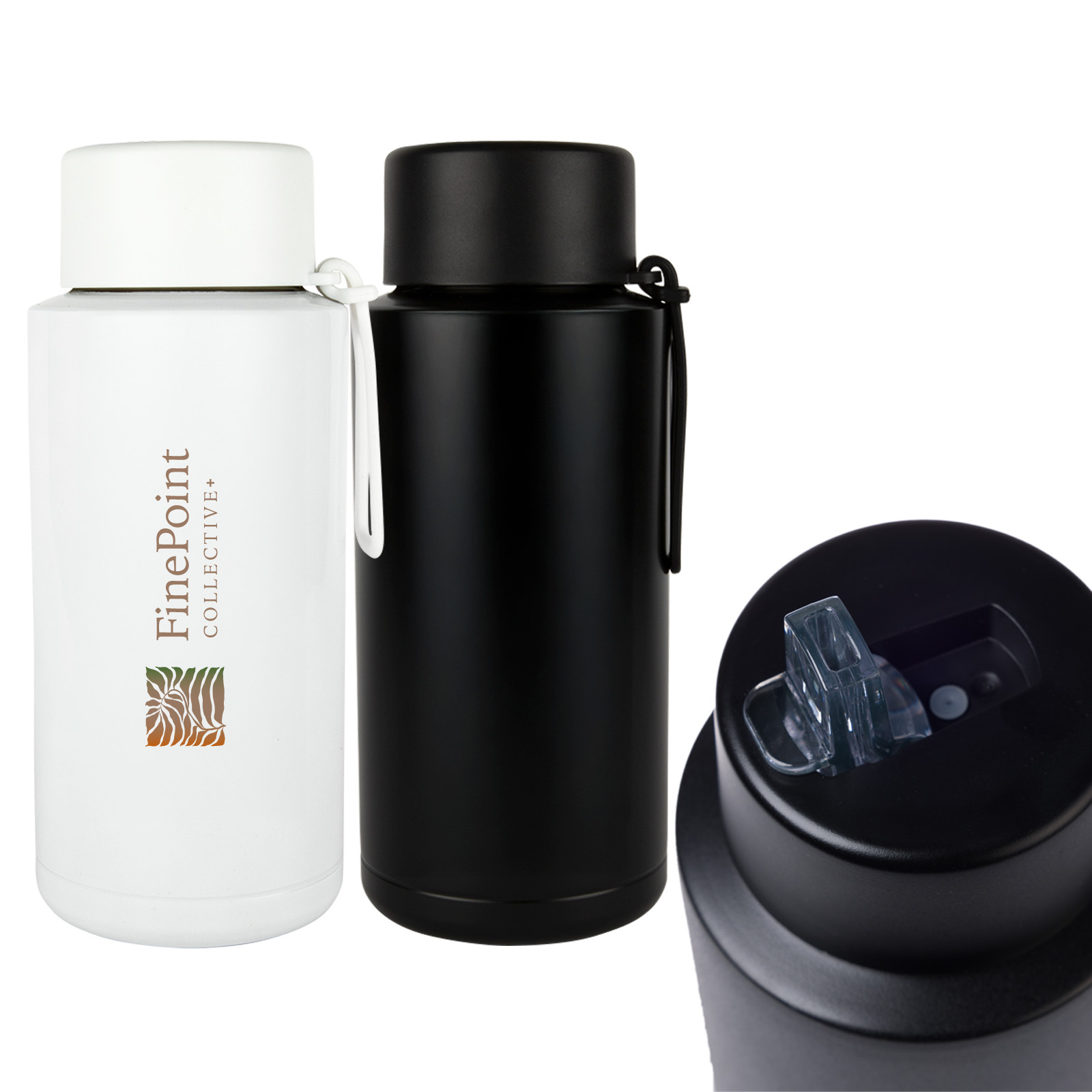 The Zara 1L Stainless Steel Bottle, your ideal choice for staying hydrated throughout the day. This large capacity bottle features double wall stainless steel construction, ensuring your beverages stay at the perfect temperature for longer. It comes with a screw-on PP sip lid, a stainless steel straw, and a clear flip-up mouthpiece for easy drinking. Each lid is equipped with a matching silicone carry strap for convenient portability. Available in stylish Matte Black or Gloss White, the bottle is presented in a craft tuck box. Its durable design and large size mean fewer refills and more convenience.