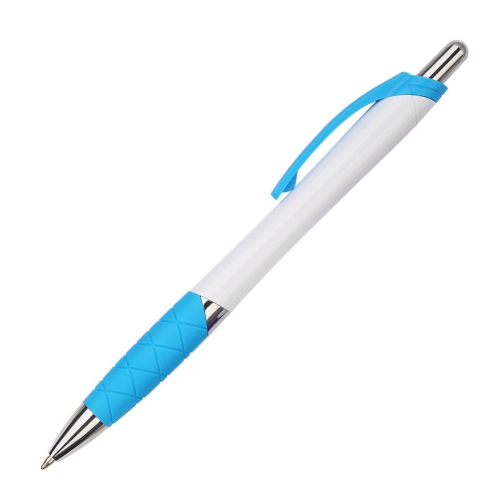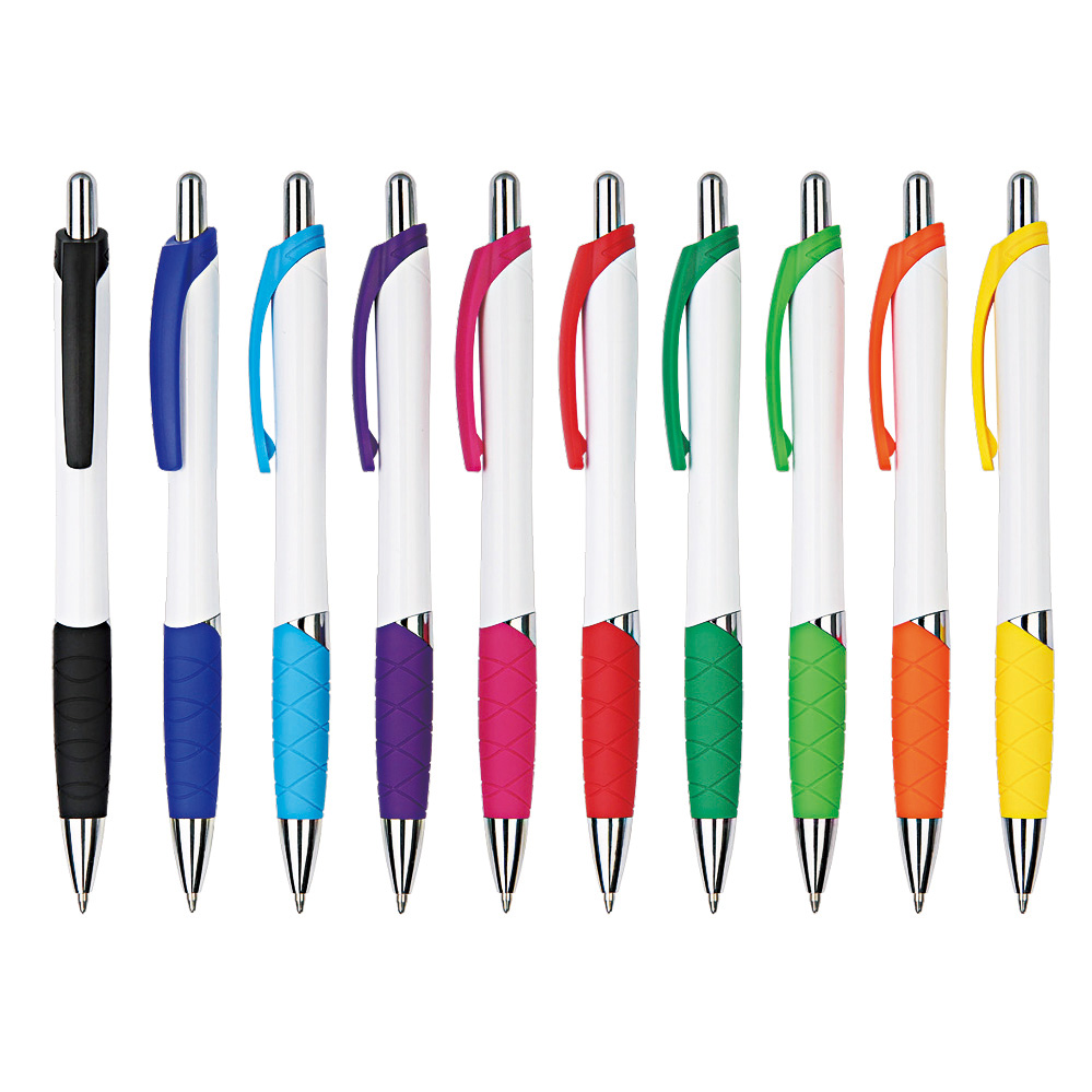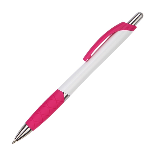 Zinna plastic pen. With interlaced lines weaving the grip along with the echo. Solid white barrel, solid coloured grip. Shiny chrome plated trims. X-20 slim refill.